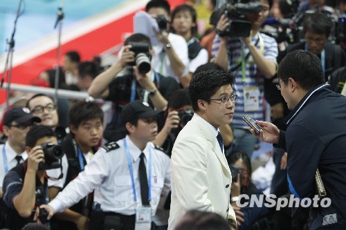 昨天東亞運(yùn)的跳水比賽,當(dāng)現(xiàn)場司儀介紹隊(duì)員名單時,霍啟剛起身走出貴賓室,來到看臺上的貴賓席。此時,記者乘機(jī)進(jìn)了貴賓席,“潛伏”在霍啟剛的后一排,與他的距離不到30厘米。