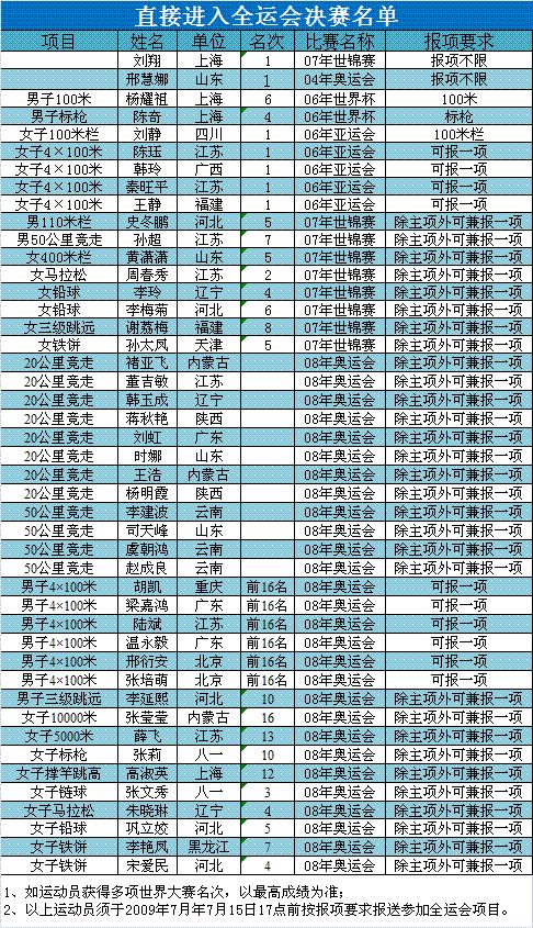 7月10日,中國田徑協(xié)會公布了直接進(jìn)入全運會決賽的田徑運動員名單。劉翔、邢慧娜、黃瀟瀟、周春秀等45名選手列入名單。入選名單的運動員還必須在2009年7月15日17時前,按報名項目要求報送參加全運會比賽的報名申請。