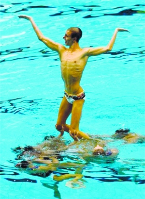 首屆男子花樣游泳世界杯在米蘭Cozzi游泳館舉行。和女子花游一樣,分為雙人和團(tuán)體兩個(gè)項(xiàng)目的比賽。為了博得關(guān)注度,男選手們紛紛在泳褲上下功夫,他們?cè)谟狙澩膺套上精心設(shè)計(jì)過(guò)的大褲衩,看著這群大男人們穿著不同花紋的大褲衩在水中上下翻飛實(shí)在讓人忍俊不禁。與女選手相比,男選手最大的區(qū)別就是上下不對(duì)稱(chēng),上半身贅肉不少的男隊(duì)員全身浸入水中,盡量露出結(jié)實(shí)有力的大腿,但還是難以讓人聯(lián)想到美。但可以肯定的是,當(dāng)花樣游泳有了男士的身影后,整個(gè)賽場(chǎng)將被歡笑與快樂(lè)籠罩。宗和
