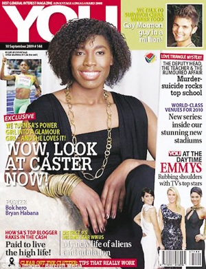 柏林田徑世錦賽上那個(gè)在跑道上讓猛男都自愧不如的800米女子世界冠軍塞蒙婭,已經(jīng)成了南非的民族英雄。盡管有報(bào)道稱她的睪丸激素含量是正常女性的三倍,國(guó)際田聯(lián)對(duì)她的性別檢測(cè)至今仍無定論,但塞蒙婭如今已搖身一變成了南非時(shí)尚雜志《YOU》的封面女郎。