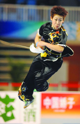 曹靜最后一個出場,當時形勢對她極為有利,只要拿到9.65分,冠軍就非她莫屬。動作質量和難度對曹靜來說沒有任何問題,關鍵是動作連接不能出現一點失誤。還是一身黑衫,最后一個出場的曹靜持刀往場地上一站,一個深呼吸,然后是一個威風的亮相,頓時全場一片叫好聲。隨后刀光一閃,曹靜快如閃電,疾如驟風,翻轉、騰挪,在陣陣喝彩聲中,曹靜舞出刀影重重。兩個馬步,一個劈叉,全都穩(wěn)穩(wěn)當當。最后,曹靜將刀拋出,然后飛身將刀穩(wěn)穩(wěn)地接在了手中。 9.83,裁判打出了全場最高分。加上棍術的得分,曹靜總分拿到19.64分,高出劉曉蕾0.19分。曹靜以巨大優(yōu)勢獲得冠軍,劉曉蕾、馬嵐分獲亞軍和季軍。有意思的是,這三人也是本次比賽女子長拳的金銀銅得主。