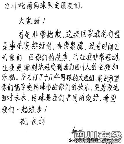 “四川輪椅網(wǎng)球隊的朋友們,大家好……”在輪椅網(wǎng)球隊隊員的簇擁下,教練陳林一個字一個字地讀著鄭潔的回信,偌大的網(wǎng)球場一下就安靜下來。上個月來到災(zāi)區(qū)獻愛心的鄭潔,通過本報記者了解到了四川輪椅網(wǎng)球隊的情況后,這位重情義的川妹子立刻承諾要寫信鼓勵隊員。在奔赴德國比賽前,鄭潔將親筆信和20多張簽名照片快遞給了本報記者,并委托記者一定要親手交到隊員們的手中。