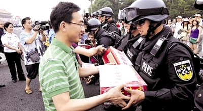 昨天下午,李瑞英、朱軍、郎永淳等中央電視臺和北京電視臺的十多位名嘴,為正在執(zhí)勤的特警隊員和交警,送去酸梅湯等夏季消暑飲品。近日,市公安局巡特警總隊,在長安街沿線及重點地區(qū)加強了巡邏防控和武裝震懾。據(jù)了解,特警們每人每天身上的槍支、防彈衣等裝備,需要負重數(shù)十公斤。“高溫酷暑,特警們還著裝整齊,一站十多個小時,他們確實是最值得尊重的!敝燔娬f。 記者 董世彪 郭曉樂 攝影報道