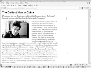 《新聞周刊》回顧了小沈陽(yáng)參加去年中央電視臺(tái)春節(jié)聯(lián)歡晚會(huì)的情景說,那天晚上,他抖的“包袱”里雖然沒有黃段子,但這名新人還是穿了一條裙子——蘇格蘭裙。在這臺(tái)晚會(huì)的6億多觀眾面前,小沈陽(yáng)一炮走紅。成千上萬的網(wǎng)民去網(wǎng)絡(luò)上搜索他的資料,他的點(diǎn)擊率一下子超過了很多中國(guó)名人。