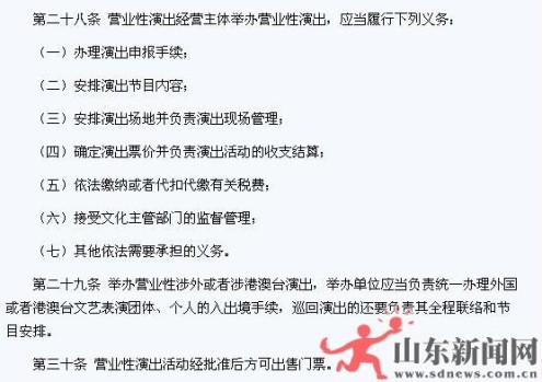 根據(jù)我國(guó)09年出臺(tái)的最新《營(yíng)業(yè)性演出管理?xiàng)l例實(shí)施細(xì)則》第二十八條規(guī)定,營(yíng)業(yè)性演出經(jīng)營(yíng)主體舉辦營(yíng)業(yè)性演出,應(yīng)當(dāng)履行辦理演出申報(bào)手續(xù)、安排演出節(jié)目?jī)?nèi)容、接受文化主管部門的監(jiān)督管理等義務(wù)。緊接著,第三十條規(guī)定,營(yíng)業(yè)性演出活動(dòng)經(jīng)批準(zhǔn)后方可出售門票。在《細(xì)則》中還明確指出,跨省區(qū)演出的,應(yīng)當(dāng)出具其他演出所在地省級(jí)文化主管部門的審核意見(jiàn)。