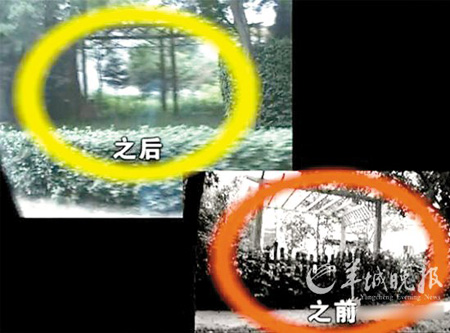 昨天上午11時(shí),記者再次來到郭宅后院,記者發(fā)現(xiàn)3個(gè)小時(shí)之前仍然存在的侵占公共綠地的綠色木柵欄已經(jīng)被拆除大部分,周邊只剩下部分被拔下來的柵欄殘骸。但是院內(nèi)假山、水池,以及綠色涼亭仍然存在。據(jù)了解,之前城管部門曾經(jīng)確認(rèn)此部分也屬違建。