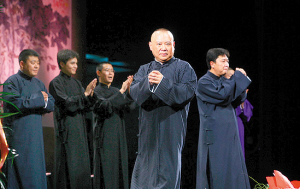 郭德綱、于謙合作10周年專場演出14日如約開場,現(xiàn)場座無虛席。此番亮相的郭德綱顯得頗為低調(diào),他在對話中表示,自己只是一個說相聲的,“能力有限,水平一般”。此次演出郭德綱個人為舟曲災(zāi)區(qū)捐出了10萬元,德云社和演出承辦方也各捐出5萬元,對于因為哀悼日而暫停的15日的演出,郭德綱表示:“所有15日票的觀眾都可以去退票,也可以留著,等我們開演的時候繼續(xù)使用,F(xiàn)在不是我們不訂演出時間,實(shí)在是北展后面的演出太多了,一切需要重新協(xié)調(diào)。”