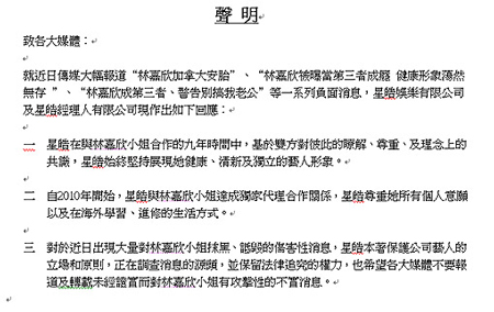 就在新聞鬧的沸沸揚揚的同時,林嘉欣所屬的香港經(jīng)紀公司星皓昨天發(fā)表聲明,提到“公司和林嘉欣合作9年,堅持展現(xiàn)她健康、清新及獨立的藝人形象。2010年彼此達成獨家代理合作關(guān)系!备鼜娬{(diào)“近日出現(xiàn)對林嘉欣抹黑、詆毀的傷害性消息,正在調(diào)查消息的源頭,并保留法律追究的權(quán)力!