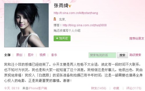 張雨綺在微博中表示:“我和汪小菲的感情已經結束了。分開主要是兩人性格不太合適,彼此有一段時間不大聯(lián)系,也不知對方狀況,我也是和大家一起知道了這個消息。我相信這是好事兒。他很出色,我由衷祝他幸福!我投入《白鹿原》的緊張準備和拍攝已有半年時間,這是一部需要也值得全身心投入的電影,正是我最喜愛的事情。謝謝!”