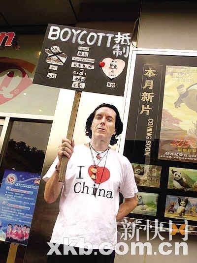 一位網(wǎng)友在他的博客中介紹了事情的經(jīng)過:“在北大教書的美國(guó)人Tim Lies和他的中文翻譯日前來到位于北京北三環(huán)的華星國(guó)際影城,手舉著一個(gè)寫著‘BOY-COTT 抵制’的牌子開始了他抵制好萊塢電影《功夫熊貓》的實(shí)際行動(dòng)。他希望中國(guó)電影不要變成第二個(gè)好萊塢!