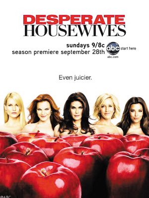 《絕望的主婦》第五季宣傳海報日前曝光。海報延續(xù)了前季的“主婦與蘋果”的創(chuàng)意,不過這次五位主婦裸露香肩,隱身于一堆蘋果后面,極盡誘惑。《絕望的主婦》第五季將于9月28日回歸。