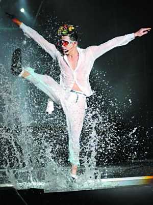 作為系列演唱會(huì)的保留項(xiàng)目,這次水花舞林表演環(huán)節(jié)賦予不少新的東西,首先是首次在T臺(tái)上表演,更加拉近與觀眾的距離;其次是前晚的氣溫只有10℃,在如此低溫的環(huán)境下“玩水”會(huì)令人更加興奮。在緩緩的流水聲中,整個(gè)舞臺(tái)被注滿(mǎn)了水,像一個(gè)巨型水池。在《唱這歌》的音樂(lè)聲中,身穿白色全套透視裝的郭富城現(xiàn)身跳起勁舞,水花一直濺射到臺(tái)下,觀眾也很興奮地迎水而舞,郭富城的紅色防水內(nèi)褲也都完全展露出來(lái),盡顯誘惑味道。而最后演唱《著迷》的時(shí)候,郭富城更用毛巾拍打舞臺(tái)的水,產(chǎn)生更多水花,將觀眾的熱情推向高潮。