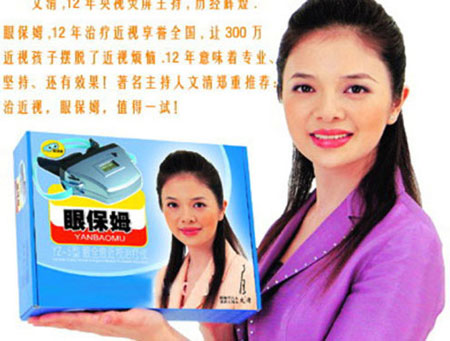 央視主持人文清曾代言治療近視的醫(yī)療器械的“眼保姆”,因廣告“涉嫌欺騙和誤導消費者”而被工商局曝光。在廣告中含有大量不科學的表示功效的斷言和保證,同時還聲稱“產(chǎn)品銷售現(xiàn)場場面壯觀、多家護眼中心產(chǎn)品斷貨”等,夸大其辭的廣告語。