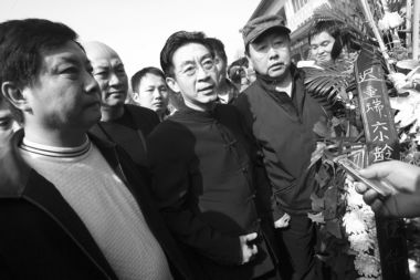 上午10點(diǎn)告別儀式開(kāi)始,人們排成長(zhǎng)隊(duì)井然有序地進(jìn)入靈堂。閆懷禮的遺體安臥在花叢中,面容安詳!吧窕觌x去芳名百世著清風(fēng),音容宛在勤奮一生傳佳話”的挽聯(lián)十分醒目。靈柩旁,六小齡童、遲重瑞、馬德華等《西游記》主創(chuàng)垂淚站立。當(dāng)《西游記》主題曲《敢問(wèn)路在何方》在靈堂響起,眾人嗚咽聲一片。