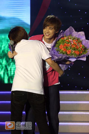 此次重回“福地”的王櫟鑫,與現(xiàn)場歌迷大玩游戲,不但與觀眾互動演繹了一出《劉?抽浴,更與歌迷親密合唱了一首《天生一對》,頗為搞怪的舞姿、多變的表情令現(xiàn)場氣氛更為火爆。和李易峰一樣,王櫟鑫也遭遇了熱情粉絲的大熊抱。