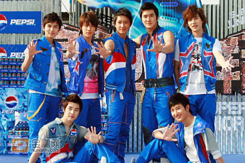 由中國成員韓庚領(lǐng)軍的超人氣男子組合Super junior-M出席某飲料簽約儀式,正式加入這個(gè)規(guī)模龐大的品牌家族。這支2008年4月在中國出道的韓國花美男組合目前已在中韓兩國都掛起了一陣颶風(fēng),這次發(fā)布會(huì)現(xiàn)場更是吸引了多達(dá)二百多位粉絲身著SJ的守護(hù)色寶藍(lán)色,早早在機(jī)場守候。大會(huì)安排了三十多名保安護(hù)駕護(hù)航,足以彰顯SJ-M的超高人氣。