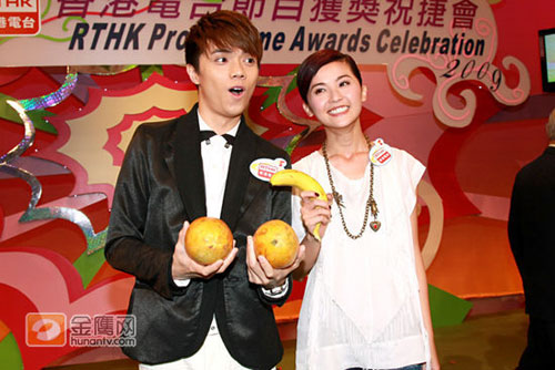 蔡卓妍(阿Sa)、張敬軒6日為港臺獲獎(jiǎng)祝捷會擔(dān)任頒獎(jiǎng)嘉賓,會上公布0八至0九年度獲得的七十七個(gè)國際及本地電視獎(jiǎng)項(xiàng);顒(dòng)后,阿Sa與軒仔影合照,軒仔拿著兩個(gè)大木瓜遞給阿Sa,并笑說:“以形補(bǔ)形!