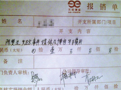 這份報(bào)銷單中,開支內(nèi)容一欄寫的是“陳楚生失蹤事件媒體及博客寫手費(fèi)用”,部門負(fù)責(zé)人審核一欄簽有天娛傳媒宣傳總監(jiān)吳夢(mèng)知的名字,公司領(lǐng)導(dǎo)審批則有天娛總經(jīng)理龍丹妮和天娛副總楊柳的簽名。