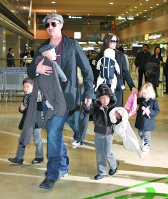 皮特和茱莉帶著6名子女到東京,分別宣傳兩人的新片《本杰明·巴頓奇事》和《換子疑云》,全家在機場獲禮遇快速完成通關(guān)。皮特胸前抱著諾克斯,左手牽著非洲裔養(yǎng)女扎哈拉,右手拉著越南養(yǎng)子帕克斯,率先入境,現(xiàn)場200多名“粉絲”瞬間陷入瘋狂,尖叫聲不斷。茱莉則是懷抱維維恩,牽著希洛與馬多克斯緊跟在后,她頻向左方護欄后的“粉絲”微笑致意,希洛看了有樣學(xué)樣,也轉(zhuǎn)身好奇地觀望群眾。馬多克斯與扎哈拉顯得心不在焉,倒是排行老二的帕克斯,似乎還不太習(xí)慣鏡頭與人群,他最后一個下飛機,入境時頻頻舉手遮眼,甚至以衣服包頭閃避鎂光燈。