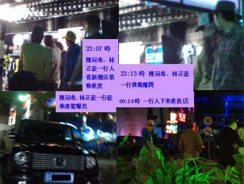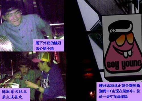 記者隨后跟出門(mén)口,卻不見(jiàn)陳冠希一行身影。而他們的奔馳座駕一直停在車(chē)位,約凌晨2時(shí)許,才見(jiàn)三名保衛(wèi)人員隨同之前陪著陳冠?瓷啼伒捻n國(guó)華裔富家林正豪出來(lái),而后打開(kāi)車(chē)門(mén),拿了什么東西,而后又回到酒吧。記者注意到,該富商一直有保衛(wèi)人員跟隨,而且當(dāng)晚一直陪同陳冠希,看來(lái)關(guān)系非同一般。此外,記者輾轉(zhuǎn)從酒吧大堂經(jīng)理處了解到,與陳冠希同行的林正豪乃韓國(guó)上流社會(huì)頗有影響力的華人企業(yè)林氏株會(huì)社貴公子,早年一直玩轉(zhuǎn)韓國(guó)時(shí)尚圈,近年也當(dāng)歌手出唱片,可謂是橫跨時(shí)裝和娛樂(lè)兩界,不僅擁有韓國(guó)頂尖潮流服裝品牌,還是韓國(guó)某娛樂(lè)公司的幕后老板,而當(dāng)晚夜店老板早就安排了陳冠希一行到來(lái)的保衛(wèi)工作。大堂經(jīng)理透露,這位韓國(guó)華裔富家林正豪也是他們老板的好朋友,此行除了陳冠希外,還有京城某地產(chǎn)商之女以及圈內(nèi)某著名女制片人之子,“身家都是上億的!