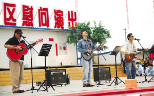 得知“心連心”前來演出,不大的擂鼓鎮(zhèn)廣場擠滿了 5000多名從四處趕來的北川人。上午9時(shí),在導(dǎo)演兼主持人馬東的“吆喝”中,央視名嘴王小丫、張澤群、董浩、撒貝寧、韓喬生樂一一亮相,分別為災(zāi)區(qū)人民送上一句祝福。而最難得的場面是平時(shí)說比唱多的央視名嘴齊秀唱功。不過最搞笑的當(dāng)屬“韓大嘴”,他一發(fā)聲,調(diào)不知跑哪兒去了,頓時(shí)笑翻全場。接下來,鞠萍、趙保樂的《為了誰》,郭峰演唱的《勝利》,孫悅等人演唱的《好人好夢》和觀眾進(jìn)行了臺上臺下的熱烈互動,把現(xiàn)場氣氛推向高潮。