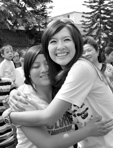 這時,一個孩子擠近章子怡身邊。章子怡問道:“小朋友,你叫什么名字?”旁邊的吳院長立即說:“子怡,這孩子有先天性聾啞,耳朵聽不見。”章子怡雙眼閃出一絲淚花,她伸出雙手立即將孩子緊緊擁抱。之后,她拿出了精美的筆記簿禮物,一一送到孩子們手上。
