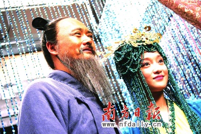 昨天下午5時(shí)左右,在涿州影視城戰(zhàn)國(guó)城內(nèi)的一座大殿里,“子見(jiàn)南子”的戲正式上演。幽暗的大廳里擺設(shè)著8座戰(zhàn)國(guó)時(shí)常見(jiàn)的犧尊造型的琉璃紗燈,褐色的紗帳從梁上垂下。而由奚仲文打造的演員服裝更是讓人眼前一亮:扮演孔子的周潤(rùn)發(fā)身穿青灰色麻布長(zhǎng)袍,頭戴同顏色的儒士巾,看起來(lái)極為樸實(shí)。而周迅扮演的南子則一身水藍(lán)色的長(zhǎng)裙,顯得雍容華貴。周迅頭頂?shù)慕鹕P冠和同樣水藍(lán)色的頭飾,據(jù)說(shuō)是由松綠石串成,因此非常沉重。在第一次試戴的時(shí)候,周迅甚至抬不起頭來(lái), 需要有人在后面幫忙才能正常行走。