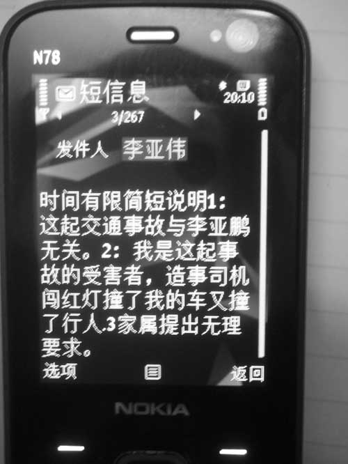 昨天,李亞偉接受了本報記者的采訪,針對“車禍門”事件,他給記者發(fā)來短信表明態(tài)度——1:這起交通事故與李亞鵬無關(guān)。2:我是這起事故的受害者,造事(應(yīng)為肇事)司機(jī)闖紅燈撞了我的車又撞了行人。3:家屬提出無理要求。