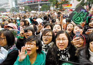 本報(bào)訊 山城昨日陰雨綿綿,不過這絲毫沒有影響到周筆暢的人氣。從中午開始,觀音橋茂業(yè)百貨外的簽售現(xiàn)場(chǎng)就聚攏起了四面八方趕來的筆迷,F(xiàn)場(chǎng)足有近二千人,超過上一次古天樂在同一地點(diǎn)簽售時(shí)的狀況。