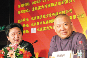 日前,“2009郭德綱圣誕喜樂會(huì)”發(fā)布會(huì)在北京舉行。郭德綱今年選擇了富力萬麗酒店,將在可容納1000人的宴會(huì)大廳里說相聲。對(duì)于最高8800元、最低1800元的高價(jià)票設(shè)定是否合理,郭德綱直言真正的“綱絲”10萬元也舍得花,這說明相聲市場(chǎng)繁榮了。