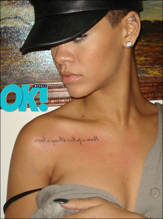 美國歌壇數(shù)一數(shù)二的潮流小天后蕾哈娜在自曝自己的手槍紋身后,再度在自己的博客中登出了全新的紋身!癗ever A Failure, Always A Lesson”這就是這位小天后在自己的鎖骨處的新紋身上面的一句話?不知道蕾哈娜想要告訴我們什么呢?