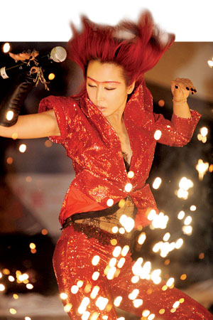火紅的頭發(fā)、紅色亮片裝以及酷似LadyGaga(以勁爆造型聞名的美國(guó)流行音樂(lè)新晉 “舞后”)造型的激光太空鏡……歌手孫悅昨日在京發(fā)行新專輯 《變》,造型大變身。