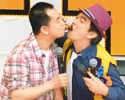 前晚兩人上《我猜我猜我猜猜猜》,介紹臺灣夜市很紅的小吃“海怪級章魚腳”,吳宗憲喂黃海波吃,但怕他咬不斷,主動用嘴巴幫忙咬,差點(diǎn)男男吻。昨晚海清錄中視《新聞6一下》,體驗(yàn)當(dāng)主播,大嘆當(dāng)主播比演戲難太多。