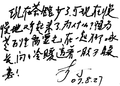 2007年,李丁做客《京華茶館》時的留言。