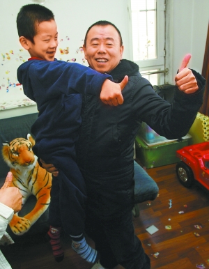 昨天上午,在本報記者和信報記者的陪同下,抱著一只玩具老虎的潘長江來到了位于南四環(huán)的韜寶家中。潘長江的到來讓韜寶的父母格外欣喜感動,但以往只在電視里見過潘長江的小韜寶起初有些“認生”。不過,當(dāng)他一眼看見潘長江手中的CD時,立刻興奮得一躍而起,拿過CD就急著要播放。尤其當(dāng)他聽到《過河》的旋律時,更是興奮地滿地打滾,并模仿起潘長江在《過河》中的表演。