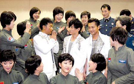 16位曾翱翔的藍天上的女飛行員們,一股腦兒地擠上前去與偶像合影,當紅女星閆妮則一掃平日里的害羞個性,看到小虎隊三人時像個小粉絲一樣跳起來表達著自己的興奮之情。一片混亂中,有位央視的記者一不留神被擠掉入彩排大廳一號入口處的水池里。某家網站的攝像記者在跟隨著小虎隊的步伐倒退著拍照時,突然流下眼淚,之后他對同行說:“鏡頭一推上去,實在是觸景生情,可能是太久沒有看到他們三個人一起出現(xiàn)了!