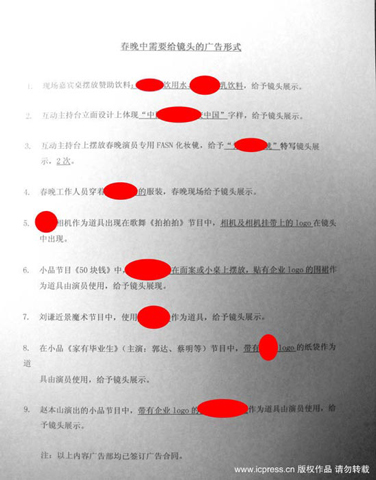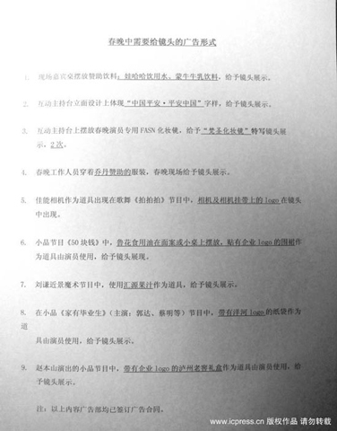 新民網(wǎng)3月2日?qǐng)?bào)道 2010年3月1日,北京,央視虎年春晚廣告植入清單曝光,列出內(nèi)容次數(shù)、注明已簽合同,春晚當(dāng)天需要給鏡頭的廣告形式都一一羅列,包括飲用水、化妝鏡、服飾、相機(jī)、酒等名目繁多。