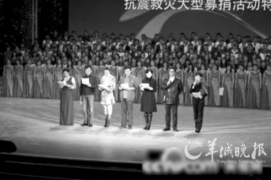 昨晚8時,《情系玉樹 大愛無疆———抗震救災(zāi)大型募捐活動特別節(jié)目》在中央電視臺現(xiàn)場直播,約有300名來自內(nèi)地和港、澳、臺地區(qū)的老藝術(shù)家、體育明星、戲曲歌唱演員參與演出。與普通的晚會不同,這次央視將節(jié)目現(xiàn)場與新聞現(xiàn)場串聯(lián),按照震后的時間順序,穿插救援畫面,再現(xiàn)了震區(qū)每天發(fā)生的感人事件,突出了節(jié)目的紀(jì)實(shí)性。