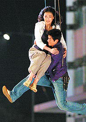 為了吊鋼絲的驚險戲碼,電影公司貼心為城城、舒淇安排替身,但2人大部分仍敬業(yè)親自上陣,為求安全,拍攝前都戴上護具做好安全措施,并試戲2、3次才正式開拍,過程大都安全順利。
