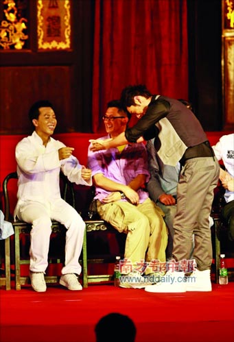 甄子丹當(dāng)日以一身白色功夫裝亮相,在隨后的發(fā)布會(huì),眾多媒體見證了他一次收下黃曉明、釋小龍和蔣岱言三位徒弟!昂_x”出來的“小李小龍”蔣岱言現(xiàn)場(chǎng)耍雙截棍,還虎虎生威地打了一套拳。之后,黃曉明等三人一起向甄子丹敬茶致禮,場(chǎng)面十分溫馨。黃曉明說自己今后將多拍“打戲”,但有記者問:“你怎么一把年紀(jì)了才來學(xué)武術(shù)?”黃曉明笑言:“活到老學(xué)到老啦。男人應(yīng)該都會(huì)點(diǎn)功夫,有強(qiáng)壯的體魄,才能保護(hù)女人!”