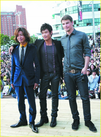 第14屆釜山影展開幕以來,喬許·哈奈特(下圖右)、李秉憲(下圖中)與木村拓哉無疑是最受矚目的3位帥哥,他們連續(xù)幾天都為新作《伴雨行》造勢(shì)。雖然木村拓哉自爆與李秉憲、喬許·哈奈特在酒店內(nèi)飲酒談心,并且他們還用了喝交杯酒的姿勢(shì)喝了很多杯。不過,有地主之利的李秉憲卻完全不顧“酒友”情,在三人同臺(tái)亮相時(shí),腳蹬近5厘米高的鞋跟,站起來硬是比號(hào)稱176厘米的木村更高一點(diǎn)。