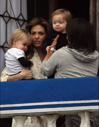 安吉麗娜·朱莉當(dāng)?shù)貢r(shí)間3月26日在位于威尼斯住所的陽(yáng)臺(tái)上抱著龍鳳胎女兒Vivienne、兒子Knox觀(guān)賞美景。就在前一天,朱莉曾抱著女兒Vivienne在陽(yáng)臺(tái)上親吻玩樂(lè),而把兒子放在房?jī)?nèi)隔窗而望。此次,身穿白色睡袍的朱莉睡眼朦朧,像是剛睡醒的樣子,她一人抱兩個(gè),生怕被說(shuō)偏心,然而她卻明顯很吃力,抱了一會(huì)便不得不讓保姆出來(lái)幫忙。