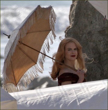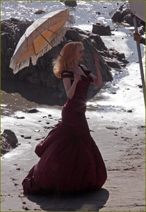 妮可·基德曼2月19日在洛杉磯的某海灘上為某雜志拍攝宣傳寫(xiě)真,當(dāng)天的妮可·基德曼化身中世紀(jì)的貴婦,穿著暗紅色的絕美長(zhǎng)裙,襯得身材玲瓏,肌膚透白,手中的陽(yáng)傘更是增添了高貴優(yōu)雅,和妮可·基德曼得天獨(dú)厚的氣質(zhì)完全符合。