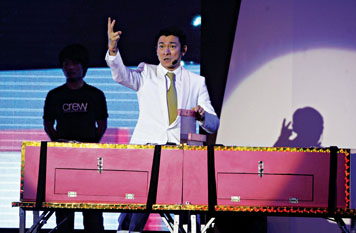 劉謙變魔術(shù),那是他的老本行,而劉德華就純粹是客串了,但在舞臺(tái)上的一招一式,劉德華倒并不業(yè)余。第一個(gè)魔術(shù)請(qǐng)出了他的“女朋友 ”:“她是我今天的女朋友哦!边呎f(shuō)邊摸著美女的手,“為了公平起見(jiàn),我要邀請(qǐng)媒體朋友一起來(lái)參與!薄斑有你,美女,我喜歡漂亮的……”還沒(méi)開(kāi)始變魔術(shù),之前的噱頭已擺得夠足!皩⒚琅P(guān)在盒子里,用鋒利的刀等工具往下插,然后盒子分離,人也就此被分尸……”表演內(nèi)容并不陌生,但出自華仔之手,粉絲們看得津津有味,尖叫聲不斷!華仔究竟用了多少時(shí)間學(xué)會(huì)變這個(gè)魔術(shù)的呢?“這個(gè)是秘密,不能告訴你們!惫首魃衩氐娜A仔透露說(shuō),自己曾經(jīng)上過(guò)劉謙的節(jié)目,也跟他學(xué)了幾招。