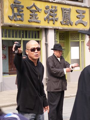根據(jù)劇組的通告,昨日《建國大業(yè)》劇組從早晨6點(diǎn)30分就開工拍攝。當(dāng)早報記者于中午時分趕到車墩時,導(dǎo)演黃建新正在“拍兩個不知名人士的戲份”,不見“蔣介石”的扮演者張國立,但劇組人員保證“張國立今天來了片場”。下午2點(diǎn),劇組午休時間結(jié)束!澳暇┞贰鄙虾鋈欢喑隽艘蝗汉谝潞诿、幫派打扮的群眾演員。同時,一輛車輪外側(cè)被涂成金色的“另類”黃包車也出現(xiàn)在“南京路”的一頭。幾分鐘后,現(xiàn)場忽然一陣騷動,許多原本在附近休息的游客都涌向了“南京路”口,拿出相機(jī)拍個不停。原來是“杜月笙”馮小剛出現(xiàn)了。同時,還有一個光頭、戴著墨鏡、手執(zhí)大喇叭的男子,在給馮小剛以及現(xiàn)場的群眾演員安排走位。仔細(xì)一看,這位“現(xiàn)場導(dǎo)演”不是別人,正是“蔣介石”張國立。原來整個上午,張國立并沒有休息,而是呆在劇組在片場臨時設(shè)置的工作室內(nèi),和另一位導(dǎo)演韓三平一起,看之前拍攝的回放。