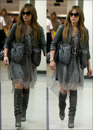 詹妮弗·洛佩茲實(shí)在是太漂亮了!結(jié)束了自己的日本宣傳活動(dòng),匆匆回國的詹妮弗·洛佩茲在機(jī)場大大的高貴了一把,灰白黑色的雪紡紗連身長裙浪漫飄逸,外面為了保暖配了皮質(zhì)外套,但是袖口處的毛毛設(shè)計(jì)極致奢華高貴,大釘子書包混搭效果明顯,大配飾項(xiàng)鏈真是好看~~小編覺得喜歡這樣浪漫奢華的MM們一定要學(xué)習(xí)學(xué)習(xí),保證是回頭率300%。