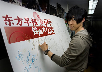 由于活動(dòng)推遲了20分鐘,唐禹哲還未坐定,電話便響個(gè)不停,而唐禹哲來(lái)不及喝口水潤(rùn)喉便認(rèn)真地與FANS聊起來(lái)。聽說(shuō)這位打進(jìn)電話的FANS,正是在前日簽售會(huì)上為自己送禮物的人,唐禹哲連連道謝,“我看到大家托你送的很大一包東西了,我很喜歡,我會(huì)帶回臺(tái)灣去的!甭牫鯢ANS對(duì)他的話持著半信半疑的態(tài)度,唐禹哲又反復(fù)強(qiáng)調(diào),“我有拆開來(lái)看過(guò),是玉和胸章對(duì)吧!”讓對(duì)方受寵若驚忍不住尖叫。