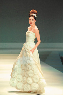 鐘嘉欣前晚為Moiselle壓軸出場(chǎng),收起笑容演繹立體花花長(zhǎng)裙。