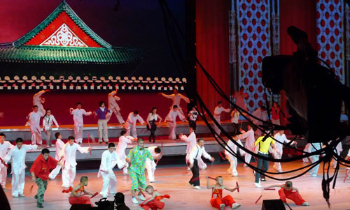 由河南少林塔溝武校表演的武術(shù)劇《功夫世家》,演員們不僅表演常規(guī)性的武術(shù),還有情節(jié)串聯(lián)其中,在昨日的彩排中備受好評(píng)。近20個(gè)不同年齡的演員組成一家人,手里拿著各種生活用品,拐杖、雞毛撣子等都被作為武器,每個(gè)人都能打上一段,中間還穿插了交誼舞、恰恰舞等元素,武術(shù)演員們搞笑的表演十分引人入勝,引得臺(tái)下觀眾大笑不止,雖然搞笑,但一看就知道是真功夫。節(jié)目的下半段,電視劇《李小龍傳奇》中李小龍的扮演者、香港演員陳國(guó)坤亮相,所有武術(shù)演員在陳國(guó)坤的帶領(lǐng)下,一起舞起了雙截棍,但因?yàn)殛悋?guó)坤是首次參加春晚,所以顯得很緊張,動(dòng)作十分不熟練,但隨后陳國(guó)坤漸漸找到了感覺,與演員的配合也默契了很多。整個(gè)節(jié)目的場(chǎng)面非常壯觀,氣勢(shì)逼人。與以往的武術(shù)節(jié)目相比,塔溝武校參加2009年央視春晚的節(jié)目在昨日的彩排中表現(xiàn)更加搶眼,使得在場(chǎng)的每一位觀眾都笑不籠嘴,甚至連鼓掌都忘記了,一直沉浸在詼諧、幽默的節(jié)目的氛圍之中。