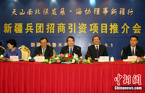 新疆生產(chǎn)建設(shè)兵團(tuán)副司令員劉新齊向參加活動(dòng)的海外僑領(lǐng)介紹了新疆生產(chǎn)建設(shè)兵團(tuán)的歷史,兵團(tuán)副政委雪克來(lái)提·扎克爾介紹了新疆兵團(tuán)的經(jīng)濟(jì)社會(huì)發(fā)展?fàn)顩r。據(jù)介紹,50多年來(lái),新疆兵團(tuán)依托大農(nóng)業(yè)優(yōu)勢(shì)和新疆礦產(chǎn)資源優(yōu)勢(shì),大力建設(shè)農(nóng)副產(chǎn)品生產(chǎn)加工基地和優(yōu)勢(shì)礦產(chǎn)資源開(kāi)發(fā)利用基地,大力實(shí)施優(yōu)勢(shì)資源轉(zhuǎn)換、開(kāi)放帶動(dòng)、科教興兵團(tuán)和人才強(qiáng)兵團(tuán),總體實(shí)力明顯增強(qiáng)。2009年,新疆兵團(tuán)實(shí)現(xiàn)生產(chǎn)總值610.69億元人民幣,人均生產(chǎn)總值達(dá)到23734元。